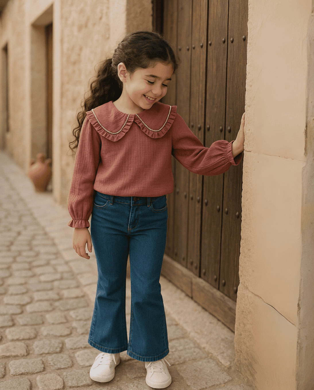 Blusa Jimena confeccionada con goma en cintura, prenda forrada en el interior, con apertura total en el delantero y bolsillos en forma de corazón confeccionados con el mismo tejido. En la parte trasera tiene una goma en la cinturilla que hace que la prenda se adapte a la figura de la peque. Una prenda ideal para combinar con blusa o jersey de punto, un básico para esta temporada.