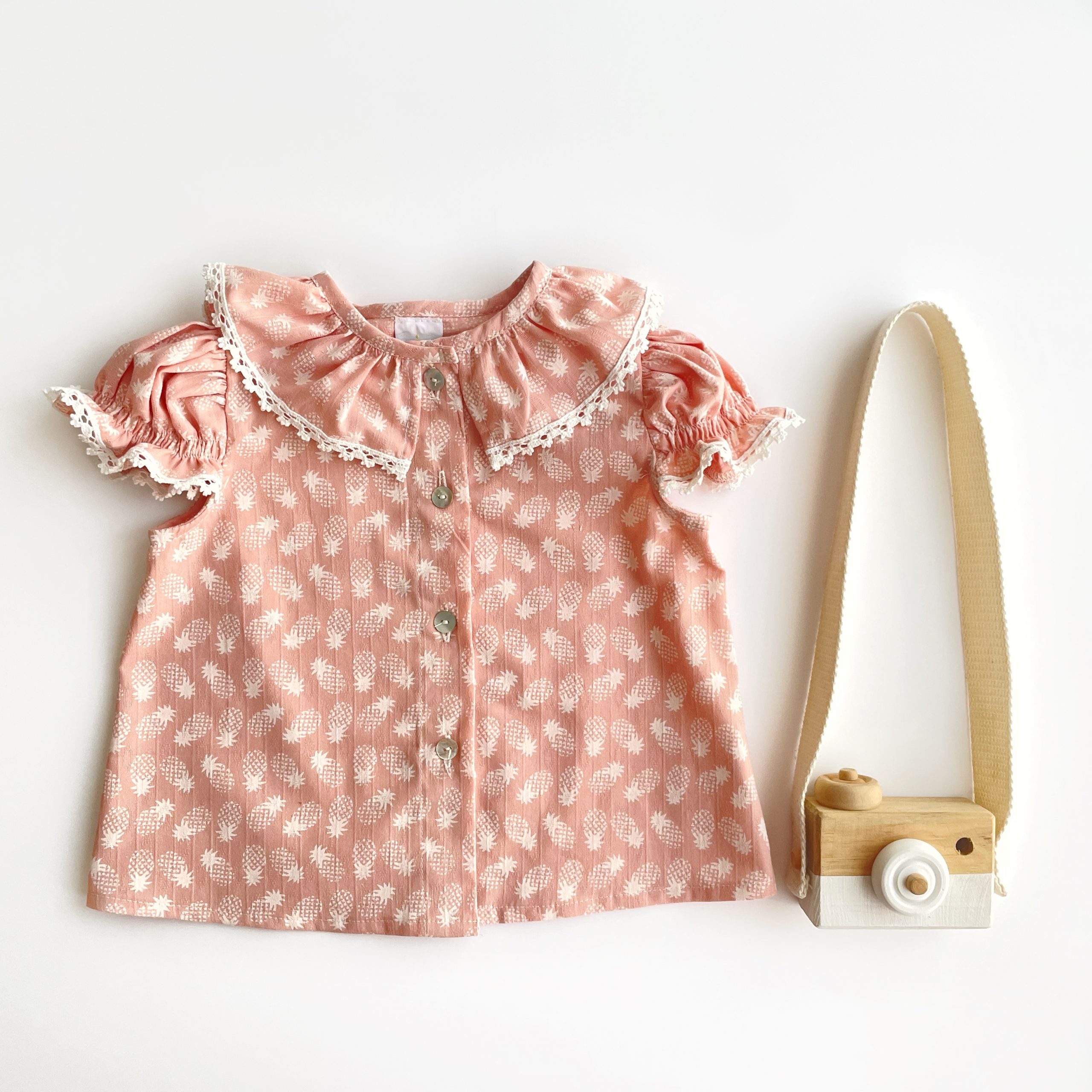 Blusa piñas, confeccionada en un gustoso tejido de color rosa con estampado de piñas. Preciosa manga abullonada y deliciosa puntilla a modo de volante en el cuello. Un básico para esta temporada.