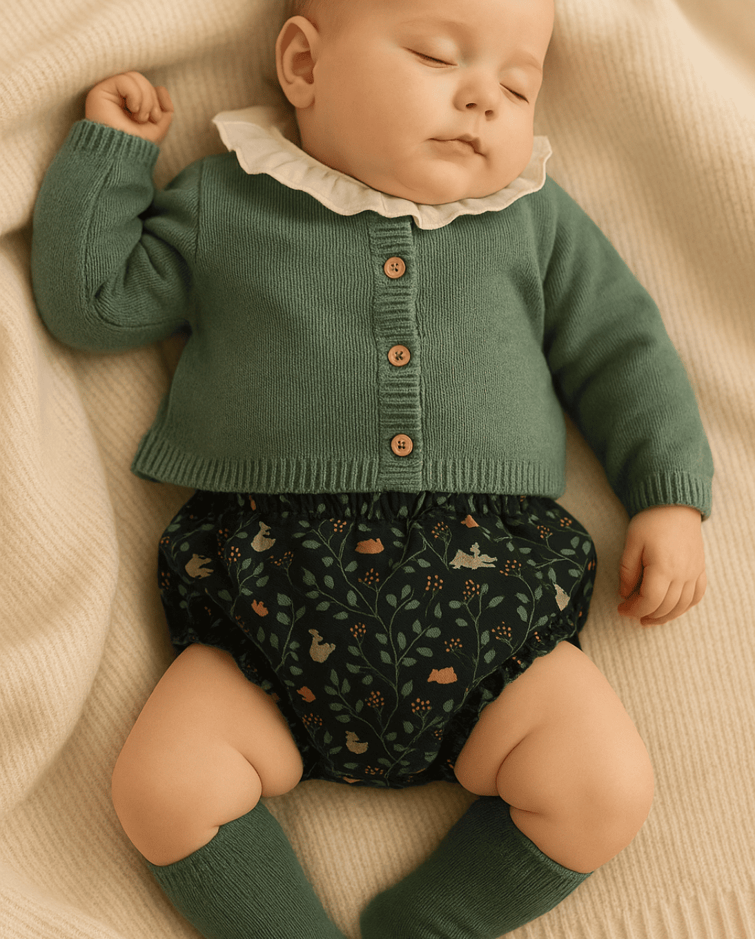 Culotte Laida puntilla confeccionada en el tejido que más te guste. Con apertura en el bajo para facilitar el cambio de pañal, tirantes que se anudan en el trasero y bolsillo en el delantero.