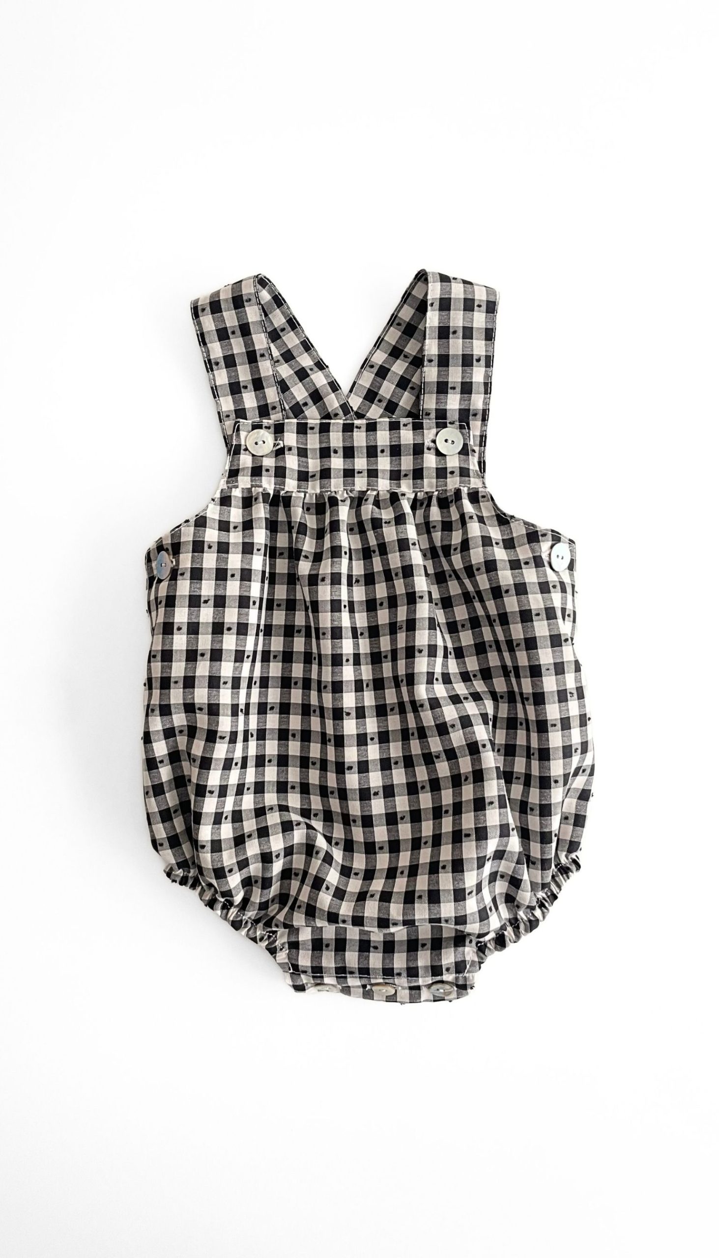 Petito unisex vichy NY, confeccionad0 con tejido vichy plumeti en negro y blanco. Esta es una prenda unisex, forrada, con botones en el bajo para facilitar el cambio de pañal y tirantes que se abotonan en la zona delantera del pecho. Los botones en los laterales y los muslos engomados hacen que se ajuste perfectamente al bebé. Un prenda ideal para lucir esta temporada.