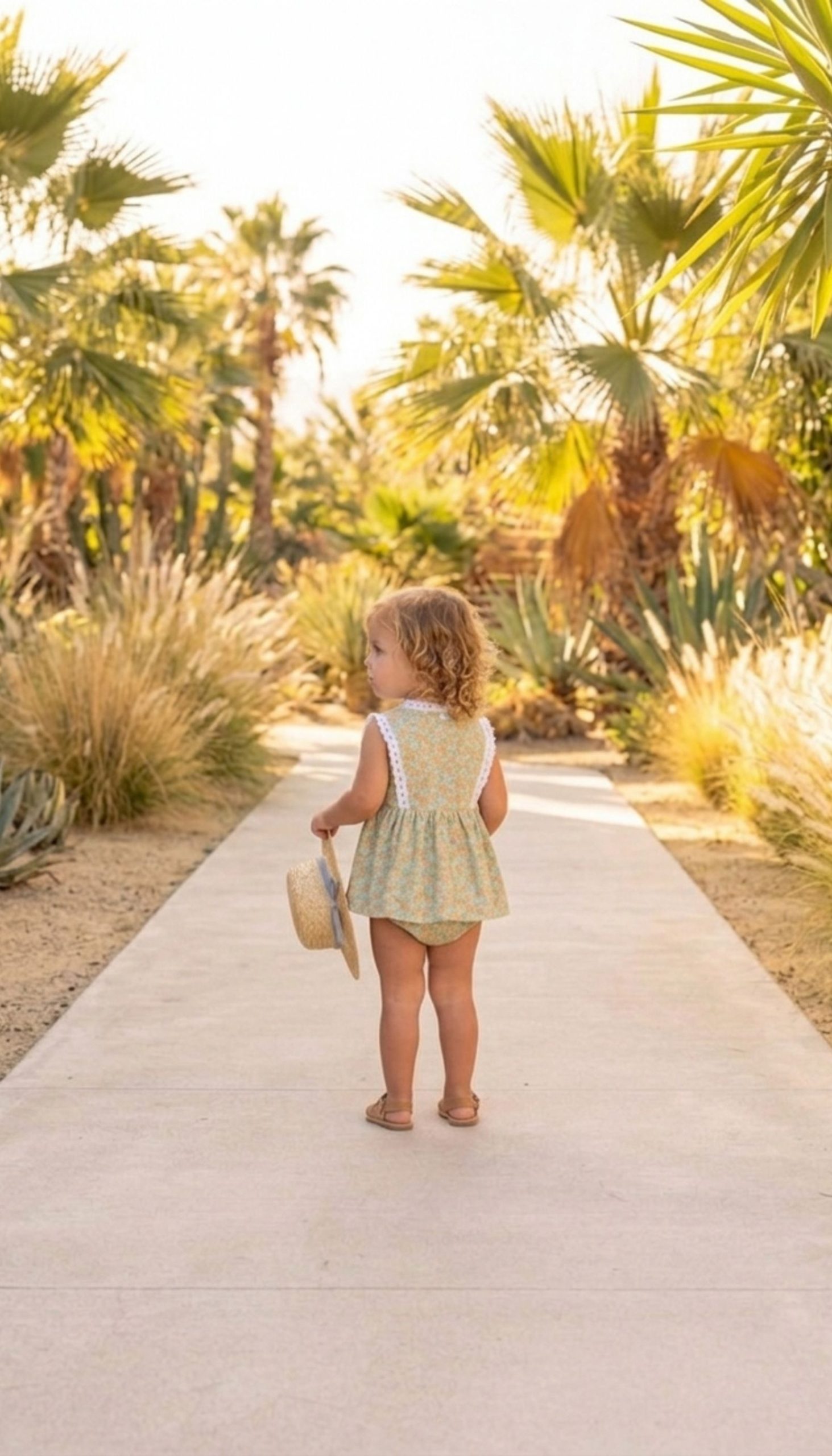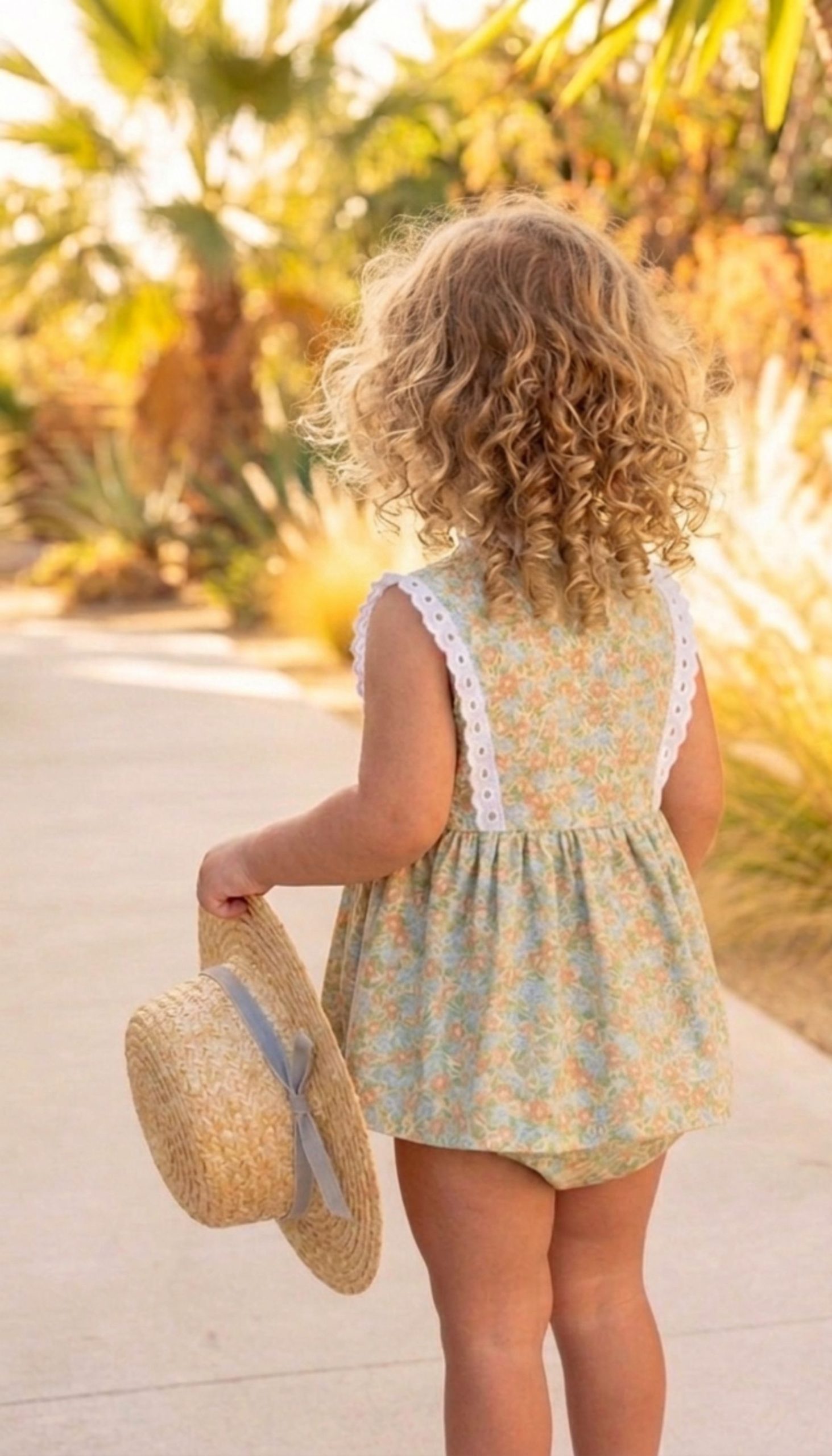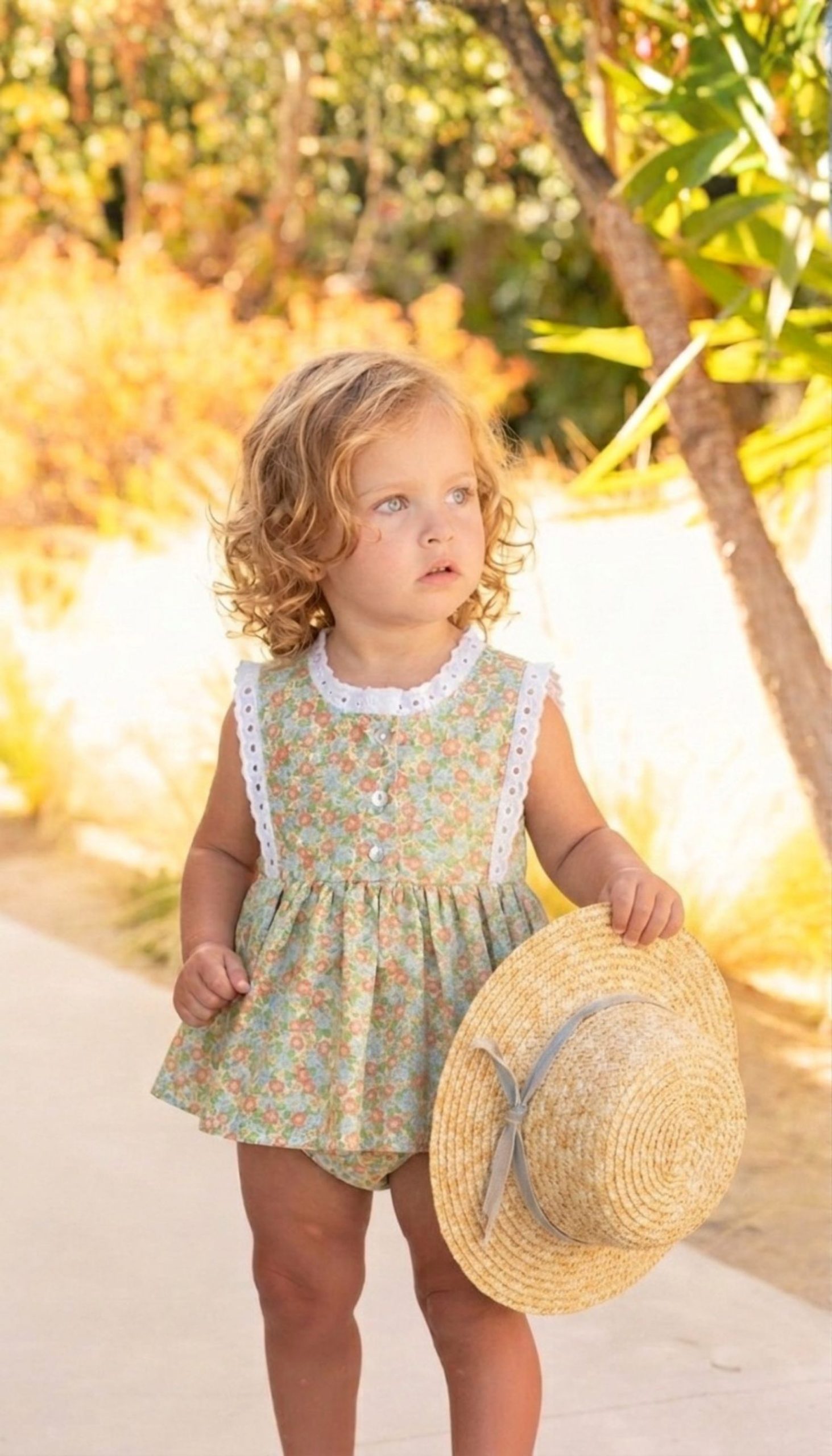 Ranita cuerpo niña liberty Florida, confeccionada en tejido liberty en tonos verdes, amarillos y naranjas, con una puntilla blanca en los laterales que le da ese toque tan especial. Prenda forrada en el interior, con apertura en el delantero, gomas en los laterales y abotonadura en el bajo para que se ajuste mejor a la figura del peque. Una prenda ideal para combinar con blusa o jersey de punto, un básico para esta temporada.